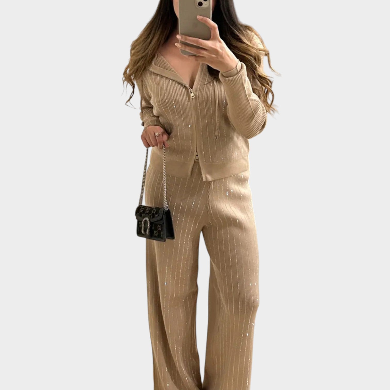 This refined two-piece set blends relaxed tailoring with a subtle shimmer for an effortlessly elevated look. Designed to feel comfortable yet polished, it transitions seamlessly from daytime outings to evening plans.